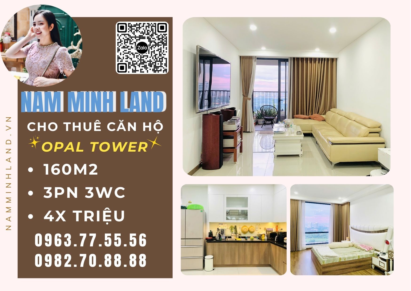 Opal Tower- Cho thuê căn hộ 3 phòng ngủ 160m2 - View sông, đầy đủ nội thất tiện nghi, thoáng rộng rãi, view ngắm được pháo hoa.